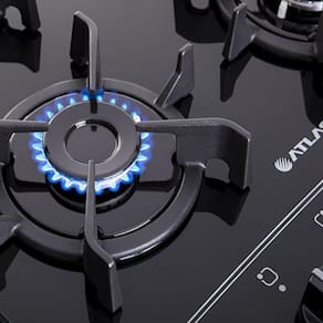 Além da mesa de vidro temperado com borda infinita e top control, o fogão ainda conta com botões removíveis, trempes de ferro fundido com 6 pontos de apoio, acendimento automático, puxador ergonômico em alumínio escovado e pés altos e robustos.