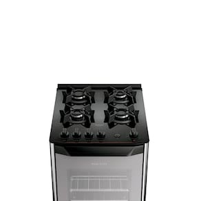 Design moderno com frente em vidro espelhado, mesa de vidro top control, acendimento automático, grades de ferro fundido com 6 pontos de apoio - que proporcionam maior e firmeza para as panelas, bordas laterais em inox, puxador amplo e ergonômico e pés robustos.