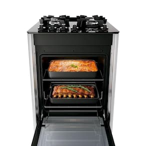 Praticidade que inspira: Duas prateleiras no forno, sendo uma autodeslizante para facilitar a retirada dos pratos e outra com altura ajustável para maior versatilidade.