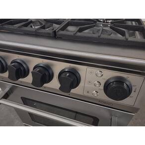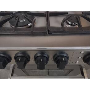 Esse Fogão é construído em aço inoxidável, com grades em ferro fundido esmaltado, botões texturizado na cor preta.