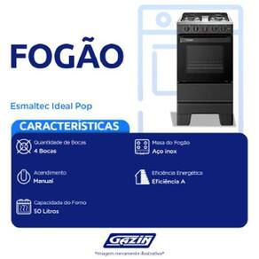 Fogao 4b Esmaltec Ideal Pop S/acend - 0104002939 Forno: B Tipo de gás: GLP Potência: 8,85 kW Volume do forno: 50 litros Outras informações : 12 meses Origem: Nacional Dimensões Altura: 88 cm Largura: 47 cm Profundidade: 57,6 cm Peso: 16,8 kg Cor: PRETO - Voltagem: SEM VOLTAGEM DESCRIÇÃO Mesa de aço inox com espaldar. Trempes duplas em aço esmaltado: mais facilidade de limpeza. Pés retos de fácil encaixe: mais altos, fortes e seguros. Puxador mais resistente, robusto e ergonômico. Forno Limpa Fácil. 1 prateleira ajustável. Porta do forno em vidro total. Vidro interno removível. Acendimento manual. Queimadores: 1 família e 3 pequenos. Clássificação: Mesa: A Marca: Não Informado Ean: 7899081700328