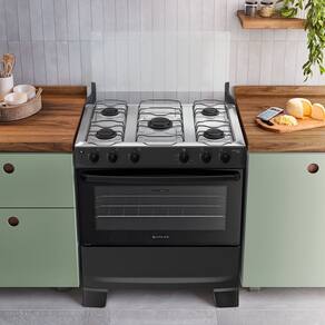 O Fogão 5 Bocas de Piso com Mesa de Inox une design moderno e alta performance com 10,34 kW de potência total e acendimento automático. Equipado com botões Front Control frontal a mesa e puxador ergonômico, ele oferece máxima segurança e praticidade no manuseio diário. Suas trempes dupla de arame garantem estabilidade, enquanto os pés altos facilitam a limpeza do ambiente. O forno de 82 litros possui acabamento Limpa Fácil, porta de vidro duplo e visor amplo para total controle dos seus assados. Sendo Bivolt e robusto, este modelo é a escolha funcional e elegante para transformar sua cozinha.