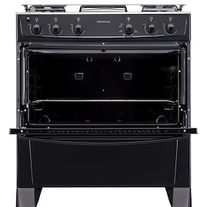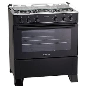 Possui mesa em inox, tampa de vidro na mesa, grades duplas de aço esmaltado, acendimento automático e botões removíveis que facilita na hora da limpeza. 2 queimadores de 1,7kW, 2 queimadores Família de 2,0kW e 1 queimador Mega Chama de 3,0kW. O forno possui visor amplo na porta, que permite enxergar tudo o que está dentro, acabamento limpa fácil, 1 grade deslizante e porta com vidro duplo - que preserva o calor.