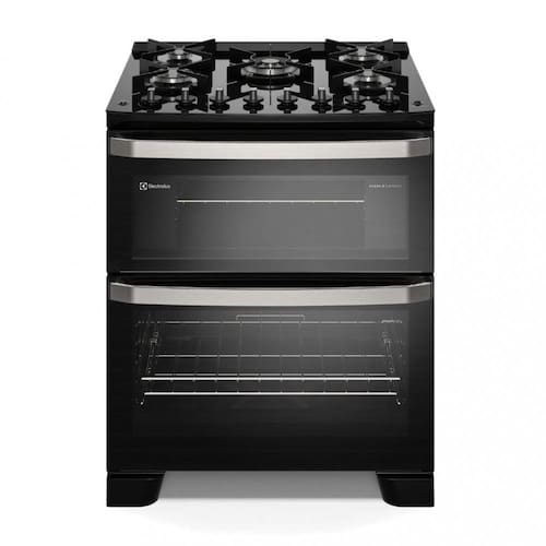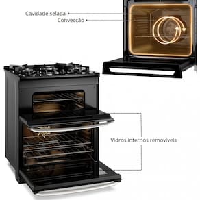 Características: Acabamento do forno Fast Clean Acendimento automático 5 Bocas Botões removíveis Classificação energética A Duplo forno Frequência 60 Hz Grades individuais Luz no forno Mesa de vidro temperado 2 Prateleiras forno principal, uma simples e outras deslizante 1 Prateleiras forno secundário simples Pés niveladores Sistema bloqueia gás Timer Analógico Tipo de forno Inferior: Gás / Superior: Elétrico Tipo de puxador Alumínio Tripla chama / multi chama Vapor Bake Volume do forno inferior 144L / superior 35,1L Vidro interno Removível Selo Inmetro 005127/2023