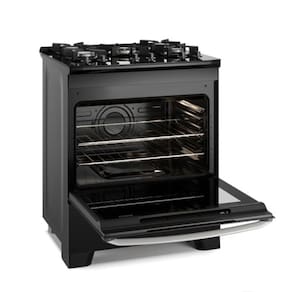 O Fogão 5 Bocas Electrolux Efficient Mesa de Vidro, PerfectCook e Grades de Ferro (FE5GB) foi pensado para tornar o dia a dia na cozinha mais prático, mas sem deixar de lado a qualidade e o sabor dos alimentos. O forno do Fogão 5 bocas Electrolux Preto Efficient Mesa de Vidro, PerfectCook e Grades de Ferro (FE5GB) tem a função PerfetCook, que possui cavidade selada e faz os alimentos serem assados por igual, deixando suas receitas muito mais saborosas. Isso acontece porque essa cavidade tem um isolamento térmico e cantos arredondados, que ajudam a reter a temperatura internamente. Além de deixar os alimentos mais suculentos, reduz o tempo de cozimento em até 18. Na parte de cima do fogão, as Trempes de Ferro Fundido dão mais estabilidade para as panelas durante o preparo. Você também pode aproveitar todo o poder do vapor em suas receitas com a exclusiva tecnologia VaporBake, que cozinha a vapor e deixa suas receitas com até 2x mais textura e crocância. Além de cozinhar, você pode usar a função Regenerar a Vapor para reaquecer os alimentos, recuperando o sabor e o aroma autênticos, sem ressecá-los. A função Tripla Chama é para quem procura agilidade nos preparos do dia a dia e precisão para as receitas mais elaboradas. Ela tem potência máxima para um cozimento mais rápido e deixa os alimentos muito mais homogêneos e saborosos. Para usá-la, você conta com o Acendimento Automático, que é rápido e seguro. A parte de cima do fogão ainda tem uma Mesa de Vidro Temperado, que, além do design moderno, é resistente e oferece praticidade na limpeza.