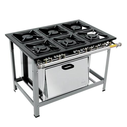 - Grelhas espaçosas de 40x40cm para panelas grandes. - Perfil de 6,5cm entre as grelhas para alta produtividade. - Ferro fundido de alta temperatura para durabilidade. - Quadro sem soldas, facilitando a limpeza. - Registros de gás duráveis em latão niquelado e cromado. - Forno em aço inox para assadeiras grandes. - Seis bocas: três queimadores duplos, três simples. - Consumo de gás de 2.700 gr/h (GLP). - Construção robusta em aço resistente à corrosão. - Medidas: Altura: 80cm x Comprimento: 144cm x Profundidade:105 cm
