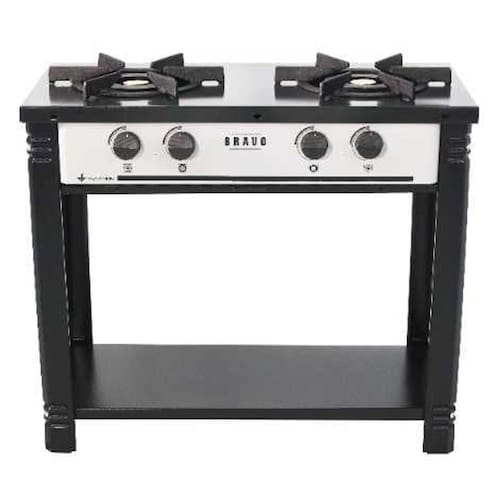 ESPECIFICAÇÕES; BR2B - Peso aproximado com embalagem: 21,5 kg - Medidas aproximadas do Produto: (LxPxA): 83 x 40 x 71 cm - Chama interna com 50mm e consumo de 0,066kg/h; - Chama dupla externa com 150mm e consumo de 0,292kg/h - Consumo total do fogão 0,716 kg/h; - Potência total de 8.160 kcal/h; - Utiliza gás GLP baixa pressão; - Mesa esmaltada a fogo, com easy clean; - Corpo em aço carbono, com acabamento em pintura a pó eletrostática com base fosfatizada; - Grelhas redondas, em ferro fundido; - Equipado com dois queimadores de chama tripla, em ferro fundido, de alto rendimento, com potência de 4.080 kcal/h cada. - Queimador chama interna, com espalha chamas em cobre; - Com controle individual dos queimadores; - Cor: Cinza.