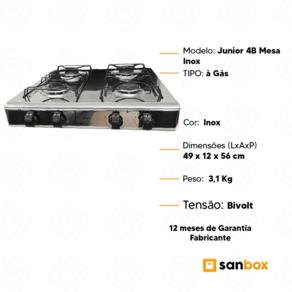 Especificações Técnicas: -Marca: Clarice -Modelo: Junior 4 Mesa Inox -EAN: 7898342105087 (Branco) -EAN: 7898342105094 (Preto) -EAN: 7908835600057 (Inox ) -Design: Produto Portátil -Tipo: à Gás - Tipo de gás: GLP -Quantidade de Bocas: 4 -Botões: Manípulos Ergonômicos -Queimadores: Sim, Queimadores Estampados -Mesa: Inox, Aço Inoxidável -Base: Branco, Aço Inoxidável -Base: Preto, Aço Inoxidável -Base: Inox, Aço Inoxidável -Trempes: Trempes Esmaltadas -Acendimento Automático: Não -Regulador: 2kg/h -Dimensões Produto (L x A x C): 49 x 12 x 56 cm -Peso: 3,1Kg -Peso Bruto: 3,8kg
