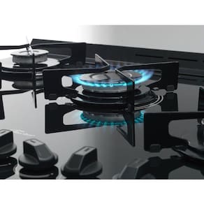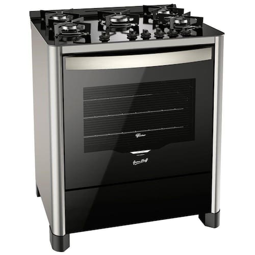 Características: Tipo de fogão: Piso Tipo de gás: GLP (conversível para GN) Bocas: 05 Acendimento: Automático total Potência dos queimadores: 1 queimador rápido (3000W) e 4 queimadores semirrápidos (1830W); Queimador do forno: 3300 Watts Iluminação interna: Sim Mesa: De vidro temperado Botões: Removíveis Trempes: Esmaltadas / Suporte da trempe esmaltado em easy clean; Forno: Esmalte Easy Clean Capacidade do forno: 110 litros Porta do forno: Com duplo vidro Temperatura mínima do forno: 190ºC Temperatura máxima do forno: 300°C Puxadores: Alumínio escovado anodizado Grade: 2 grades cromadas, ajustáveis, deslizantes e removíveis; Sistema de segurança corta gás: Válvula corta gás Frequência: 60 Hz Classificação Energética: A Bivolt Consumo de gás: 1,024 kg/h Certificado pelo Inmetro: Portaria 400