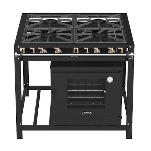 Tipo: Fogão industrial Marca: Venax Acendimento: Manual Queimadores: 4 Queimadores duplos(200mm) Espalha chama: Ferro fundido Trempe dos queimadores: Ferro fundido(400x400mm) Mesa dos queimadores: Aço revestido com pintura eletrostática Perfil da mesa: Estilo "U" (70mm) Bandeja coletora de resíduos: Sim Botões: Metálicos Forno: Sim Prateleira do forno: 1 Regulável Revestimento do forno: Limpa fácil Isolamento do forno: Lã de vidro Termômetro no forno Sim Porta do forno: Aço com visor de vidro Puxador da Porta: Aço com baquelite Estrutura do fogão: Aço revestido com pintura eletrostática Entrada de gás: Dupla(reversível) Medidas do produto: Altura 84cm - Largura 97cm - Profundidade 108cm