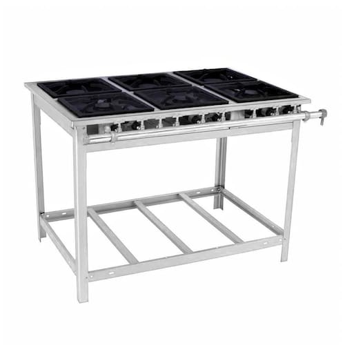 Gás GLP baixa pressão; - Estrutura totalmente em aço inoxidável; base fostatizada, grelha 30x30 e mesa com perfil de 5cm; - Tubo distribuidor (varão) de 3/4" cromado, possuindo tampão e entrada de gás reversível; Registro cromado de 1/4"; - Totalmente desmontável para facilitar o transporte e armazenamento; - Modelos produzidos com tampão no distribuidor, para posterior colocação de registro para forno; - Grelhas e queimadores em ferro fundido, queimadores simples com 100mm de diâmetro e duplos de 160mm; - Queimadores de alto rendimento, possuindo potência de 1.938kcal/h no modelo simples e 4.959 kcal/h no modelo duplo; - Queimador com encaixe de fácil remoção para limpeza e manutenção; - Fácil regulagem de entrada de oxigênio; - Chapa bifeteira opcional em ferro fundido, com dupla face, sendo um lado liso e outro para grelhados; - Limpeza e manutenção facilitados, pois os queimadores são encaixados facilitando a remoção; - Equipamento para uso industrial e profissional.