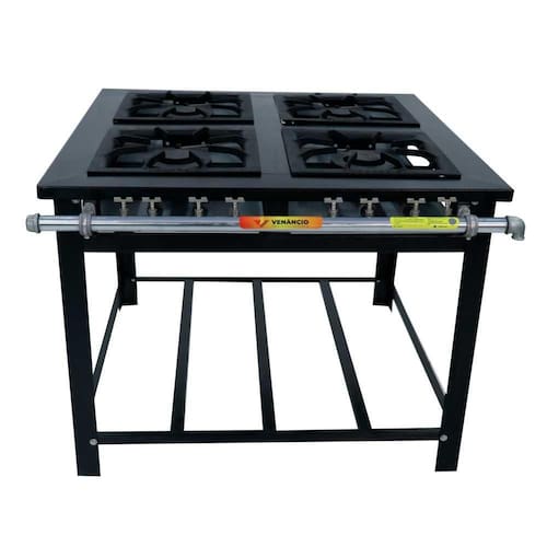 - Gás GLP baixa pressão; - Tudo distribuidor (varão) de 1" com acabamento cromado, possuindo tampão e entrada de gás reversível; - Queimadores simples (120mm de diâmetro) e duplos (180mm - com controle individual das chamas) em ferro fundido, fixos por encaixe; - Queimadores de alto rendimento, possuindo potência de 3.021 kcal/h no modelo simples e 5.586 kcal/h no modelo duplo; - Totalmente desmontável, facilitando o transporte e armazenagem; - Corpo e mesa de aço carbono super resistente, com acabamento em pintura pó eletrostática, com base fosfatizada, grelha de ferro fundido de 40x40cm e mesa com perfil 10cm; - Todos os fogões, a partir de 2 queimadores, são produzidos com tampão para posterior colocação do forno; - Registro cromado 1/4"; - Bandeja coletora em aço galvanizado; - Limpeza e manutenção facilitadas, pois os queimadores são encaixados, facilitando a remoção; - Equipamento para uso industrial e profissional.