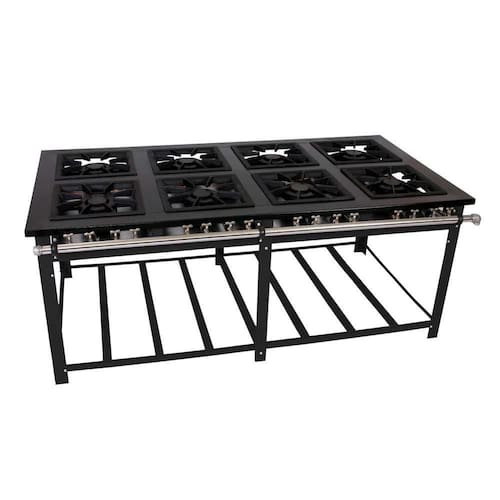 - Gás GLP baixa pressão; - Tudo distribuidor (varão) de 2" com acabamento cromado, possuindo tampão e entrada de gás reversível; - Queimadores duplos (180mm - com controle individual das chamas) em ferro fundido, fixos por encaixe; - Queimadores de alto rendimento, possuindo potência de 3.021 kcal/h no modelo simples e 5.586 kcal/h no modelo duplo; - Totalmente desmontável, facilitando o transporte e armazenagem; - Corpo e mesa de aço carbono super resistente, com acabamento em pintura pó eletrostática, com base fosfatizada, grelha de ferro fundido de 40x40cm e mesa com perfil 10cm; - Todos os fogões, a partir de 2 queimadores, são produzidos com tampão para posterior colocação do forno; - Registro cromado 1/4"; - Banho-maria opcional com acabamento esmaltado à fogo; - Bandeja coletora em aço galvanizado; - Limpeza e manutenção facilitadas, pois os queimadores são encaixados, facilitando a remoção; - Equipamento para uso industrial e profissional.