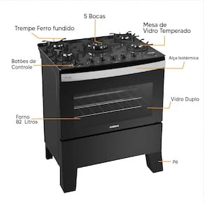 5 Bocas Potentes: Perfeitas para diferentes tipos de preparos, do mais rápido ao mais elaborado. Forno Amplo de 82 Litros: Ideal para assados, bolos e tortas, com espaço para preparar receitas variadas com eficiência.