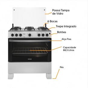 Forno Amplo e Funcional O forno com 88,5 litros de capacidade é ideal para assar desde os menores até os maiores pratos. Ele possui vidro temperado, que oferece segurança e visibilidade durante o uso, além de contar com tecnologia de isolamento térmico que mantém o calor uniforme para resultados perfeitos.