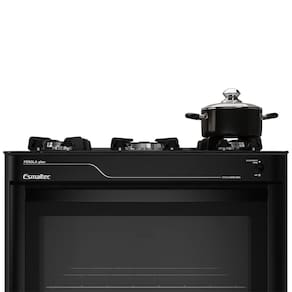 O modelo conta com queimador Tripla Chama, que acelera o preparo dos alimentos ao distribuir o calor de forma mais eficiente. As trempes de aço garantem firmeza no uso, enquanto o acendimento automático facilita o dia a dia.