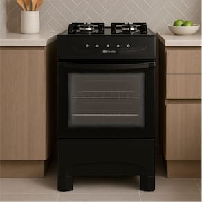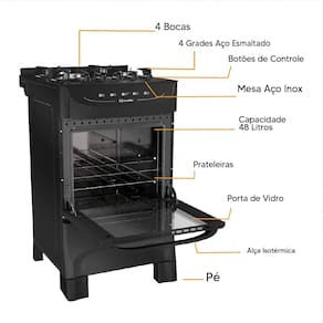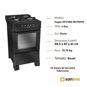 Especificações Técnicas: -Marca: Mueller -Modelo: Fogão MFV4BB 4B PRETO - Muelle -Código: 000000000610000683 -EAN: 7908156904377 -Cor: Preto Fosco -Contem Tampa: Não -Bocas: 4 bocas -Tipo de Acendimento: Automático. -Mesa: Vidro Temperado -Grades de Mesa: 4 Grades de Aço Esmaltado Individuais 6 pontos de apoio -Botões: Removíveis -Queimadores: Aço Esmaltado em Preto Fosco -Queimador Ultra chama: Não -Queimador Tripla Chama: Não -Queimador Dupla Chama: Não -Queimador Família: 2000W -Queimador Médio: 1700w -Luz no Forno: Não -Acabamento do Interior do Forno: Emaltado em total Clean -Puxador do Forno: Aço -Porta do Forno: De Vidro -Prateleiras do Forno: Uma grade Ajustável em dois níveis de altura -Temperatura do forno (grau célsius): 170 -290°C -Potência do Queimador do Forno(watts): 1900W -Capacidade do Forno (Litros): 48 Litros -Proteção Térmica Traseira: Sim -Válvula de Segurança: Sim -Tipo de gás: GLP (Conversível para GN) -Botijão: P13 -Dimensões Produto (L x A x C): 48,5 x 87 x 61 cm -Tensão: Bivolt -Peso: 19,75 kg -Peso Bruto: 21,75 kg