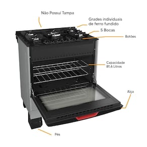 O forno espaçoso com 81,6 litros de capacidade, vidro duplo e prateleira ajustável garante versatilidade e desempenho para assar com perfeição. As trempes em ferro fundido garantem estabilidade e durabilidade superiores.