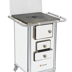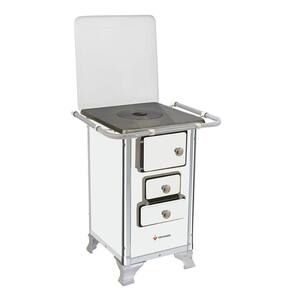 O Fogão a Lenha 00 é Pequeno, conta com corpo totalmente em aço carbono com acabamento esmaltado a fogo na pintura Branca. Seus pés são em ferro fundido com pintura em alumínio, contando também com cantoneiras em aço inox e guarnições em ferro fundido cromado garantindo qualidade exclusiva e um ótimo acabamento da peça.