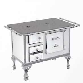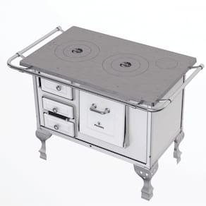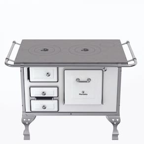 Fogão a lenha com chapa fundida e polida, frente e laterais esmaltadas, gaveta para cinzas, forno esmaltado com espelho em aço inox, quadros em alumínio, guarnições em aço esmaltado, puxadores e cantoneiras em aço inox, pés em ferro fundido.Tipo