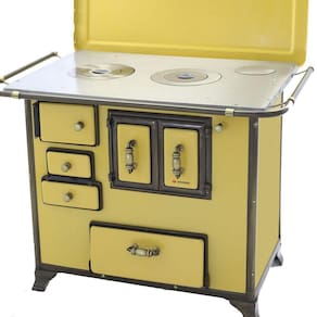 O Fogão a Lenha Barroco Número 03 de Gabinete conta com corpo e forno totalmente em aço carbono com acabamento esmaltado a fogo na pintura Amarela. Seus pés são em ferro fundido com acabamento em ouro envelhecido no modelo rústico, conta também com varões em tudo de aço e guarnições em ferro fundido também com acabamento em ouro envelhecido garantindo qualidade exclusiva e um ótimo acabamento no seu Fogão a Lenha.