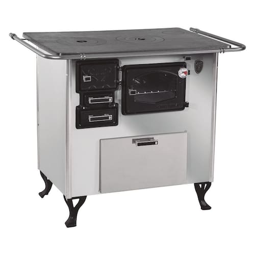 Fogão a lenha com forno em aço inox, chapa de ferro fundido polido, termômetro, caixa de lenha e isolamento térmico.Tipo