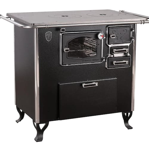 - Portas do fogão em ferro fundido acabamento cromado;