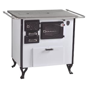 Fogão a lenha branco com forno, ideal para cozinhas e áreas de festa. Possui chapa de ferro fundido, forno em aço inox, termômetro e caixa de lenha.Tipo