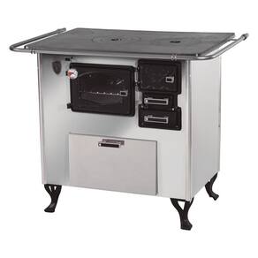 Fogão a lenha de inox com forno e caixa de lenha, ideal para cozinhas e áreas de festa. Possui chapa de ferro fundido polido, varão de proteção em inox, portas e grade do fogo em ferro fundido.Tipo