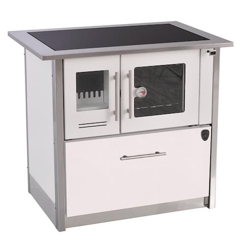 Chapa do fogão em vitrocerâmica, Forno em aço inox, Grade do forno em inox, Portas do fogão e do fogo em aço carbono, Grade do fogo em ferro fundido, Com caixa de lenha, Puxadores de inox, Mexedor de brasa em Inox, Termômetro, Saída do cano N 11.5Tipo