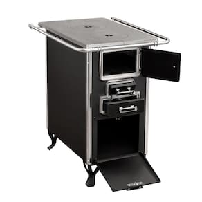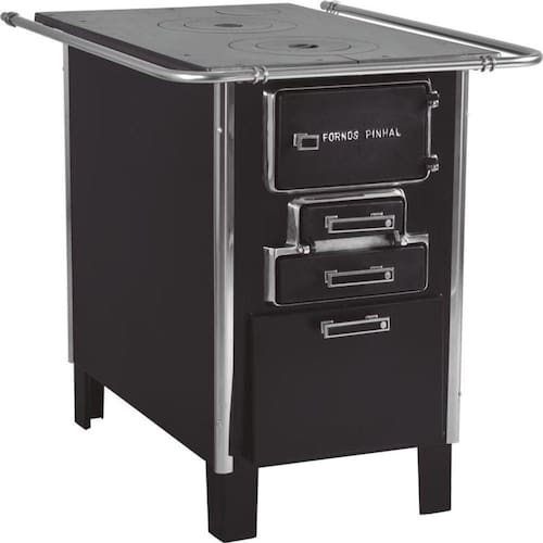 Fogão a lenha econômico com chapa de ferro fundido polido, varão de proteção inox, portas em ferro fundido com acabamento cromado, grade do fogo em ferro fundido, puxadores com acabamento cromado, mexedor de brasa e pés fixos com caixa de lenha.Tipo