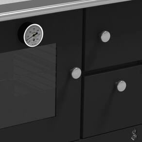Fogão a lenha Elegance Master N1 Esquerdo com chapa de alumínio fundido, revestimento térmico, tijolos refratários, grade em ferro fundido, varão de proteção em inox, interior do forninho em inox 430, visor do forninho em vidro temperado e termômetro.Tipo
