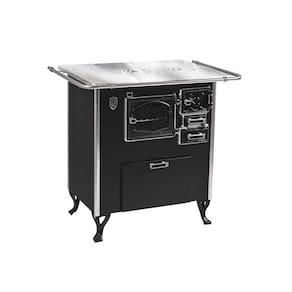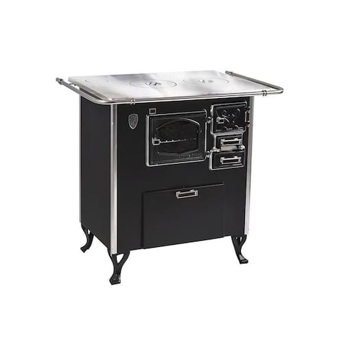 Fogão a lenha com forninho, ideal para cozinhas e áreas de festa. Possui chapa de alumínio polido, varão de proteção em inox, forno em aço inox, portas em ferro fundido com acabamento cromado e pés em ferro fundido.Tipo