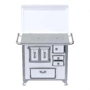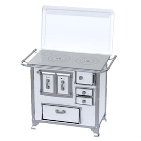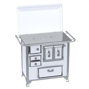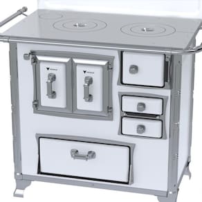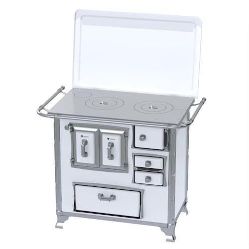 Fogão a lenha com chapa de ferro fundido polido, varão de proteção em tubo de aço cromado, forno com porta dupla esmaltada e estufa com porta em aço esmaltado.Tipo