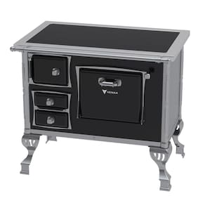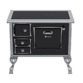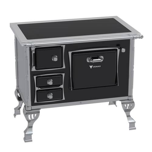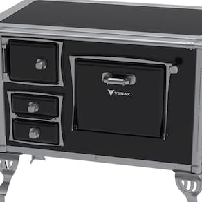Fogão a lenha com chapa de vitrocerâmica, moldura em inox escovado, varão de proteção frontal cromado, fornalha de tijolos, grade do fogo em ferro fundido, cantoneiras em inox, pés e guarnições das portas em alumínio polido, corpo e forno esmaltado.Tipo