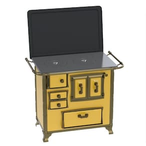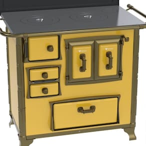 Fogão a lenha Venax GII N 1 Renaissance Amarelo, com chapa de ferro fundido polido, varão de proteção com acabamento em ouro envelhecido, fornalha com tijolos pré-moldados e forno com volume de 28L. Possui estufa com volume de 66L e acessórios como pá e gancho.Tipo
