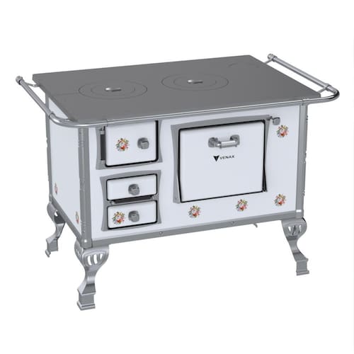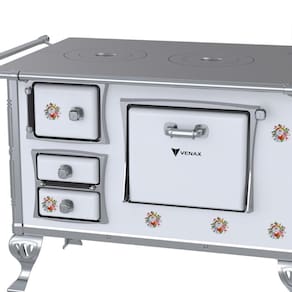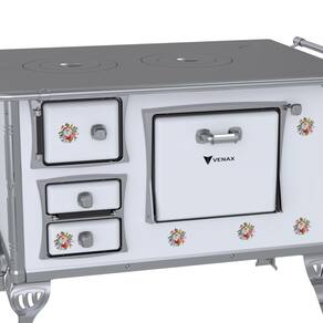 Fogão a Lenha GII N2 Tradicional, com Chapa de Ferro Fundido Polida, Varão de Proteção Cromado, Corpo em Chapa QCV esmaltada, Cantoneiras e Suporte dos Varões em Inox, Guarnições das Portas e Pés em Alumínio Polido, Forno Esmaltado, Puxadores em Zamak.