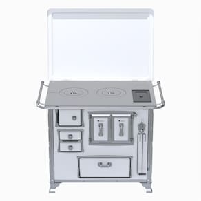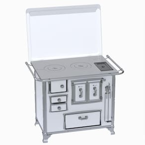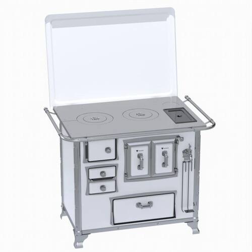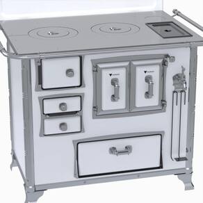 Fogão a lenha com chapa de ferro fundido polido, varão de proteção cromado, caldeira, forno com prateleira regulável, estufa, porta da fornalha e gaveta de cinzas em aço esmaltado. Inclui acessórios para manuseio.Tipo