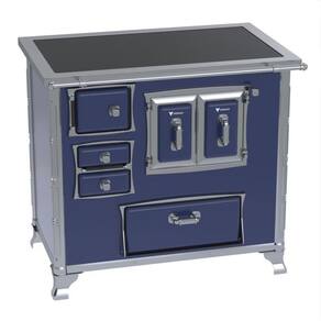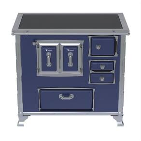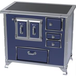 Fogão a lenha com chapa de vidro vitrocerâmico, moldura em inox, varão de proteção cromado, forno esmaltado com prateleira regulável e estufa com porta em aço esmaltado.Tipo