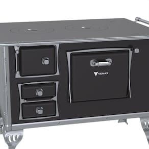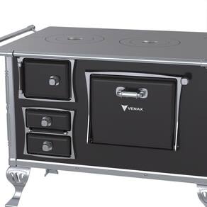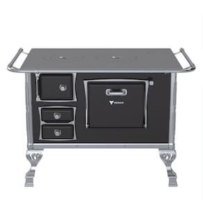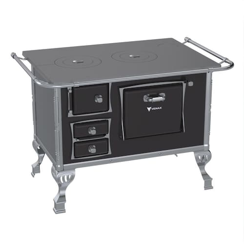 Características: Fogão a Lenha GII N2 Tradicional, com Chapa de Ferro Fundido Polida, Varão de Proteção Cromado, Corpo em Chapa QCV esmaltada, Cantoneiras e Suporte dos Varões em Inox, Guarnições das Portas e Pés em Alumínio Polido, Forno Esmaltado, Puxadores em Zamak.