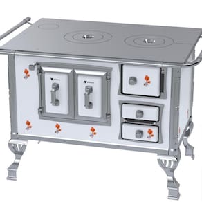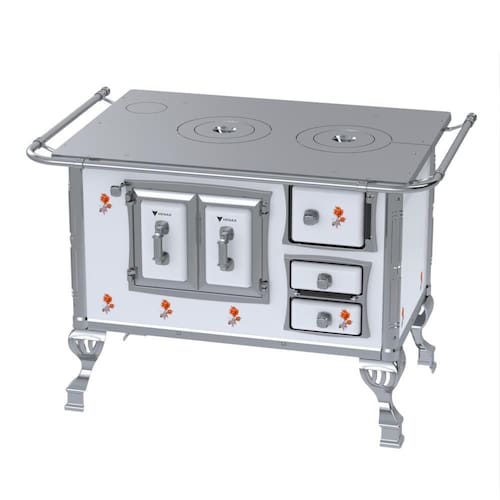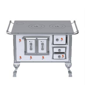 Fogão a lenha com chapa de ferro fundido polida, varão de proteção cromado, corpo em chapa esmaltada, cantoneiras em Inox, porta dupla no forno, guarnições e pés em alumínio polido, forno esmaltado e puxadores em Zamak.Tipo