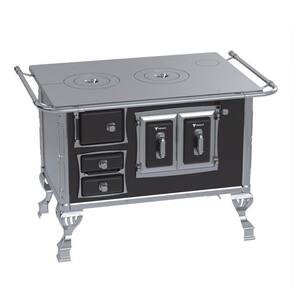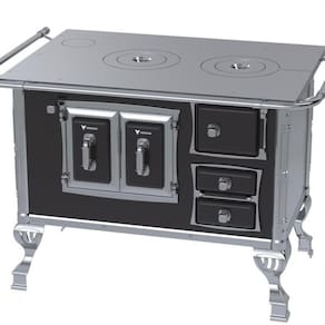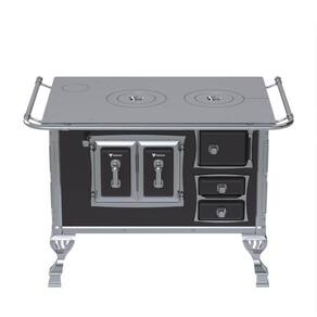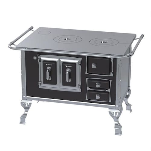 Fogão a lenha com chapa de ferro fundido polido, varão de proteção em tubo de aço cromado, forno esmaltado com prateleira regulável e porta com dupla camada e moldura cromada. Possui gaveta de cinzas e acessórios para manuseio.Tipo