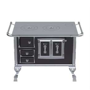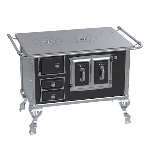 Fogão a lenha com chapa de ferro fundido polido, varão de proteção em tubo de aço cromado, forno esmaltado com prateleira regulável e porta com dupla camada e moldura cromada. Possui gaveta de cinzas e acessórios para manuseio.Tipo