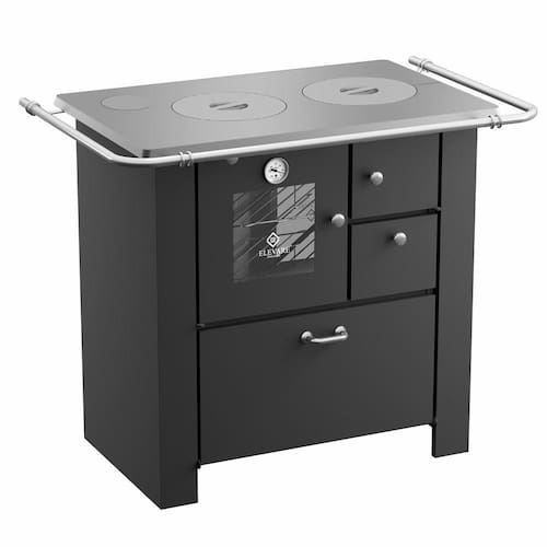 Fogão a lenha com chapa de alumínio, forno, termômetro, mexedor de brasa, pés com regulagem de altura, acabamento em pintura epóxi, revestido com isolamento térmico e tijolos refratário no queimador, grade do queimador em ferro fundido, varão de proteção inox, interior do forninho e grade em inox 430, visor do forninho em vidro temperado.Tipo