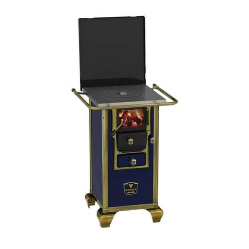 Fogão a lenha Venax Imperador Vítreo com acabamento em ouro envelhecido, ideal para ambientes compactos. Possui chapa de ferro fundido polido, varão de proteção em tubo de aço, porta da fornalha com vidro vitrocerâmico, gaveta de cinzas e acessórios para manuseio.Tipo