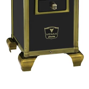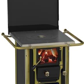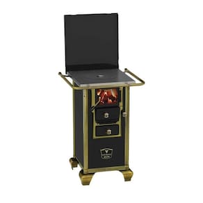 Fogão a lenha com acabamento refinado em ouro envelhecido, ideal para ambientes compactos. Possui chapa de ferro fundido polido, varão de proteção e pés com design Séc. XV.Tipo