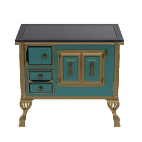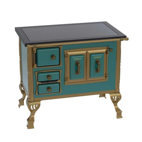 - Tipo: Fogão a Lenha; - Chapa: Vidro Vitrocerâmico com Moldura Revestida em Preto; - Varão de proteção: Tubo de Aço com Acabamento em Tom Ouro Velho*; - Suporte Varão de proteção: Modelo Séc. XVIII com Acabamento em Tom Ouro Velho*; - Caldeira: Não; - Fornalha: Tijolos Pré-Moldados; - Porta da Fornalha: Aço Esmaltado; - Tranca na Porta da Fornalha: Não; - Porta de Ar: Aço Esmaltado; - Gaveta de Cinzas: Sim; - Porta da Gaveta de Cinzas: Aço Esmaltado; - Forno: Sim; - Porta do Forno: Aço Esmaltado com Moldura em Alumínio e Acabamento em Tom Ouro Velho*; - Prateleira do Forno: 1 Regulável; - Estufa: Não; - Base Armazenamento de Lenha: Não; - Cantoneiras: Tom Ouro Velho*; - Guarnições da Porta: Design Séc. XVIII, Tom Ouro Velho*; - Puxadores: Design Séc. XVIII, Acabamento em Tom Ouro Velho*; - Tampa: Não; - Pés: Tom Ouro Velho*; - Acessórios: Pá e Gancho para Manuseio; - Saída da Chaminé: Saída na direita, nas Costas (Olhando de Frente); - Revestimento Corpo do Produto: Esmalte; - Serigrafia: Não; - Serpentina: Não; - Marca: Venax.