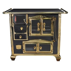 Fogão a lenha com chapa de ferro fundido polido, varão de proteção em tubo de aço com acabamento em Yellow Gold, porta da fornalha com vidro vitrocerâmico, forno com prateleira regulável e estufa. Design Séc. XV com acabamento em Yellow Gold.Tipo