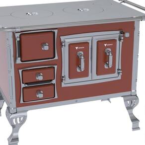 Características: Fogão a Lenha N1 Séc.XVIII, com Chapa de Alumínio Polida, Varão de Proteção Cromado, Corpo em Chapa QCV esmaltada, Cantoneiras em Inox, Suporte dos Varões em Zamak, Porta Dupla no Forno, Guarnições das Portas e Pés em Alumínio Polido, Forno Esmaltado, Puxadores em Zamak.