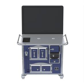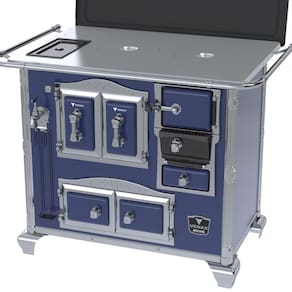 Fogão a lenha com chapa de alumínio polida, forno e estufa, design do século XVIII com acabamento cromado.Tipo